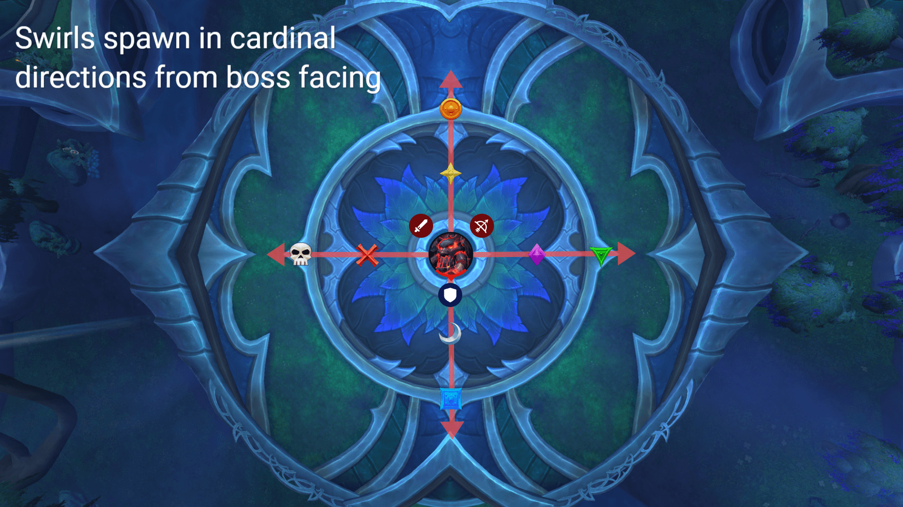 - Phase 1, the boss spawns lines of swirls with dormant adds in the four cardinal directions from his facing. The raid must drop puddles that cover those dormant adds to activate them over the course of the phase.